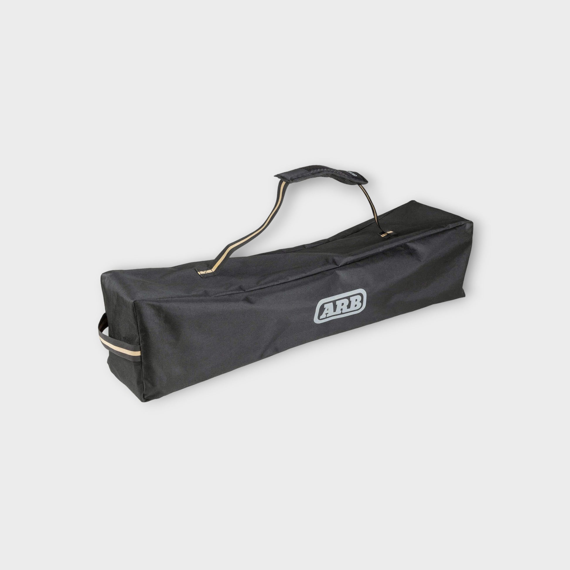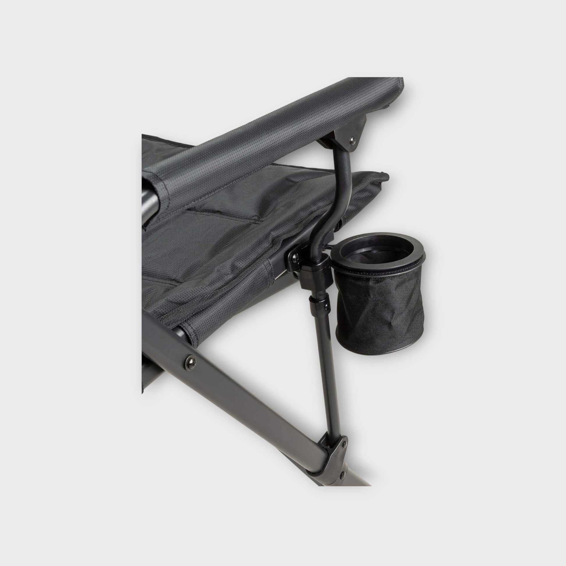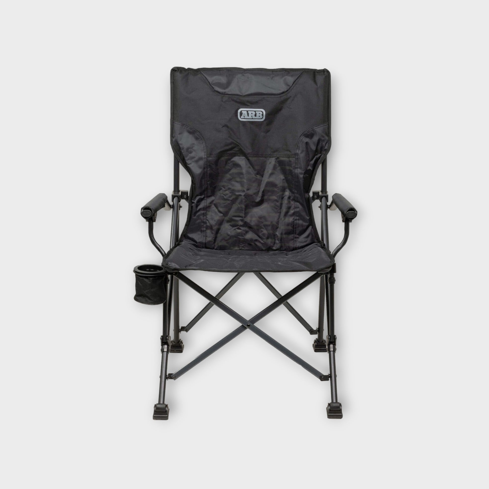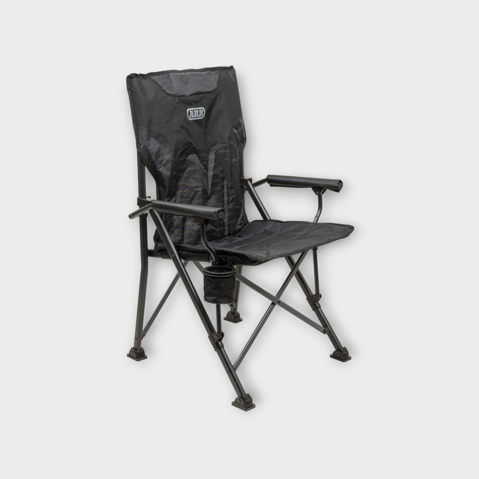 The ARB Base Camp Chair is the perfect all-round chair for traveling. It features a sturdy, sleek black steel frame with contrasting charcoal crossbars. The chair's body is made from 600D polyester and 420D ripstop panels and features a tonal print and internal padding. Padded armrests provide homelike comfort. The chair also features a rear mesh storage pocket and a swivel cup holder to keep your drink close. A spacious 600D polyester carry bag accompanies the chair, featuring webbing straps and a premium shoulder pad for easy storage and carrying.